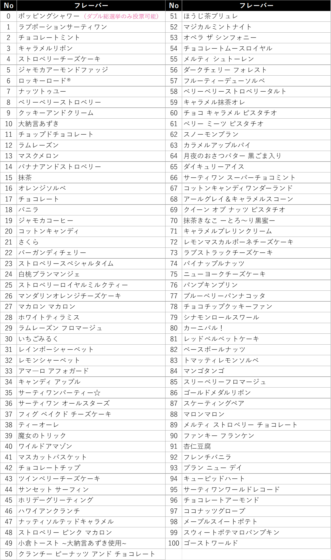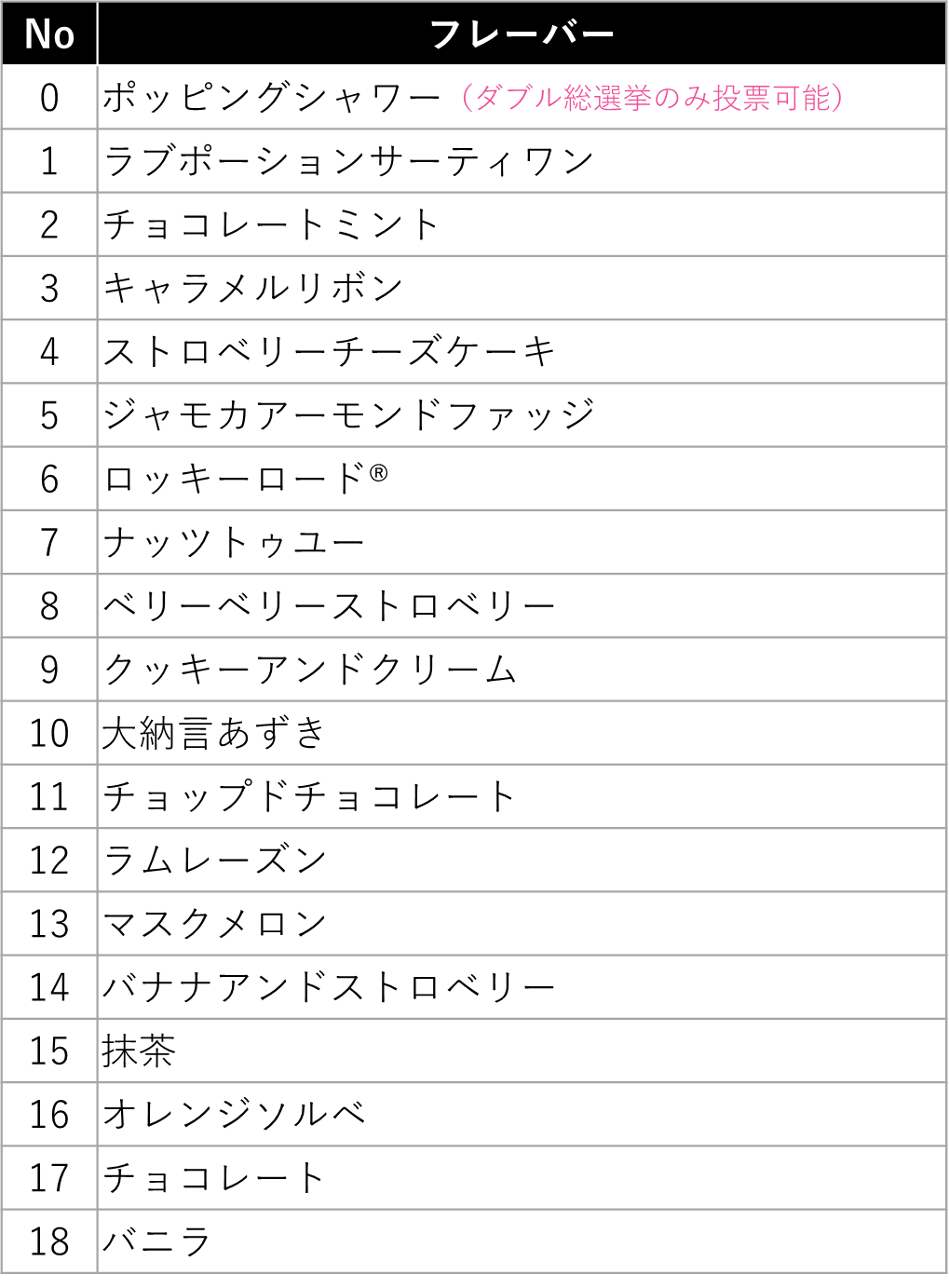 前回の総選挙で上位入賞した「マジカルミントナイト」「ダイキュリーアイス」、最近販売して大人気だった「ハワイアンクランチ」「チョコレートムースロイヤル」など、ファンの多いフレーバーたちが一体何位にランクインするのか目が離せません。