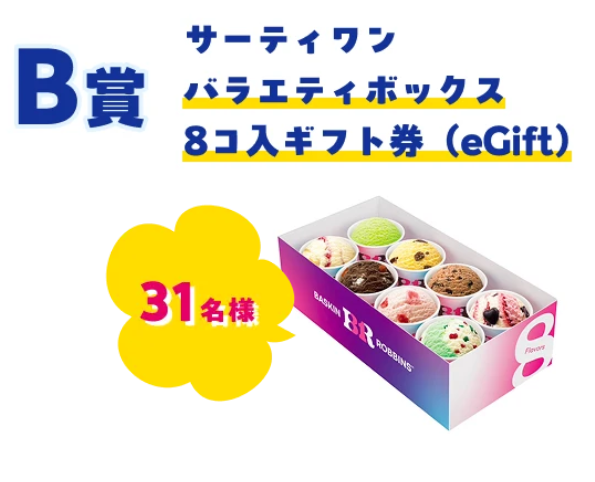 B賞:サーティワンバラエティボックスレギュラー8 コ入ギフト券(eGift)を31名様にプレゼント