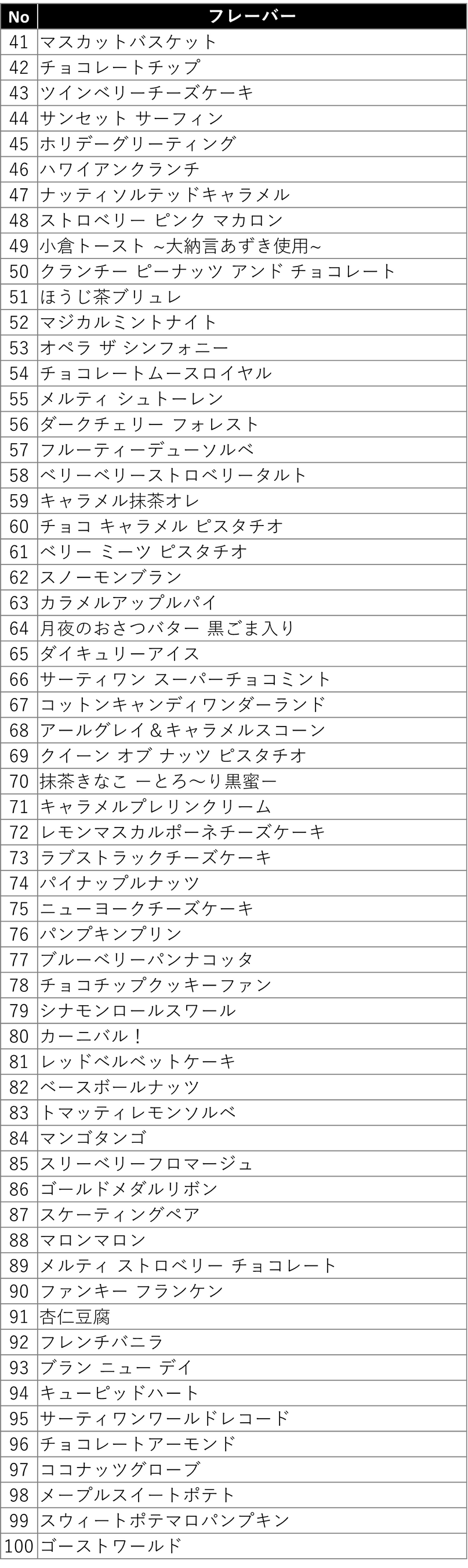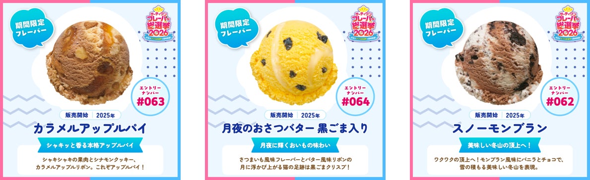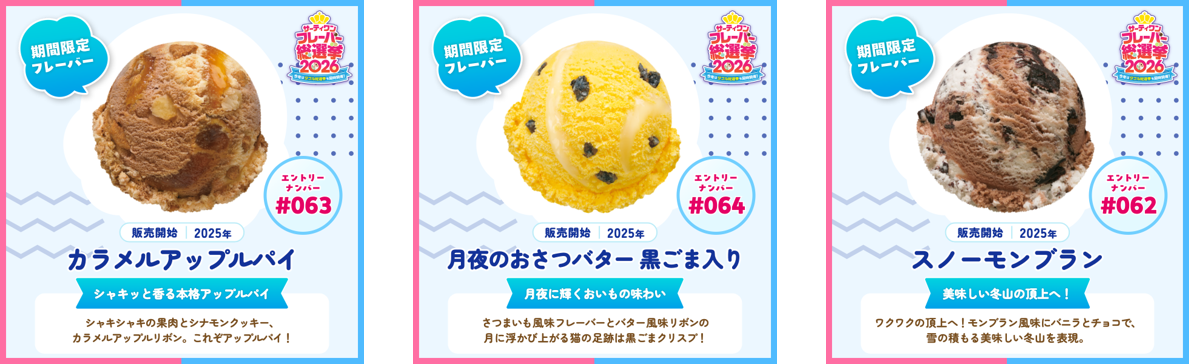 また、前回はエントリーしていなかった、近年の新作フレーバー「カラメルアップルパイ」や「月夜のおさつバター 黒ごま入り」、フレーバーコンテストの優勝フレーバー「スノーモンブラン」など、新しいフレーバーたちにも注目です。