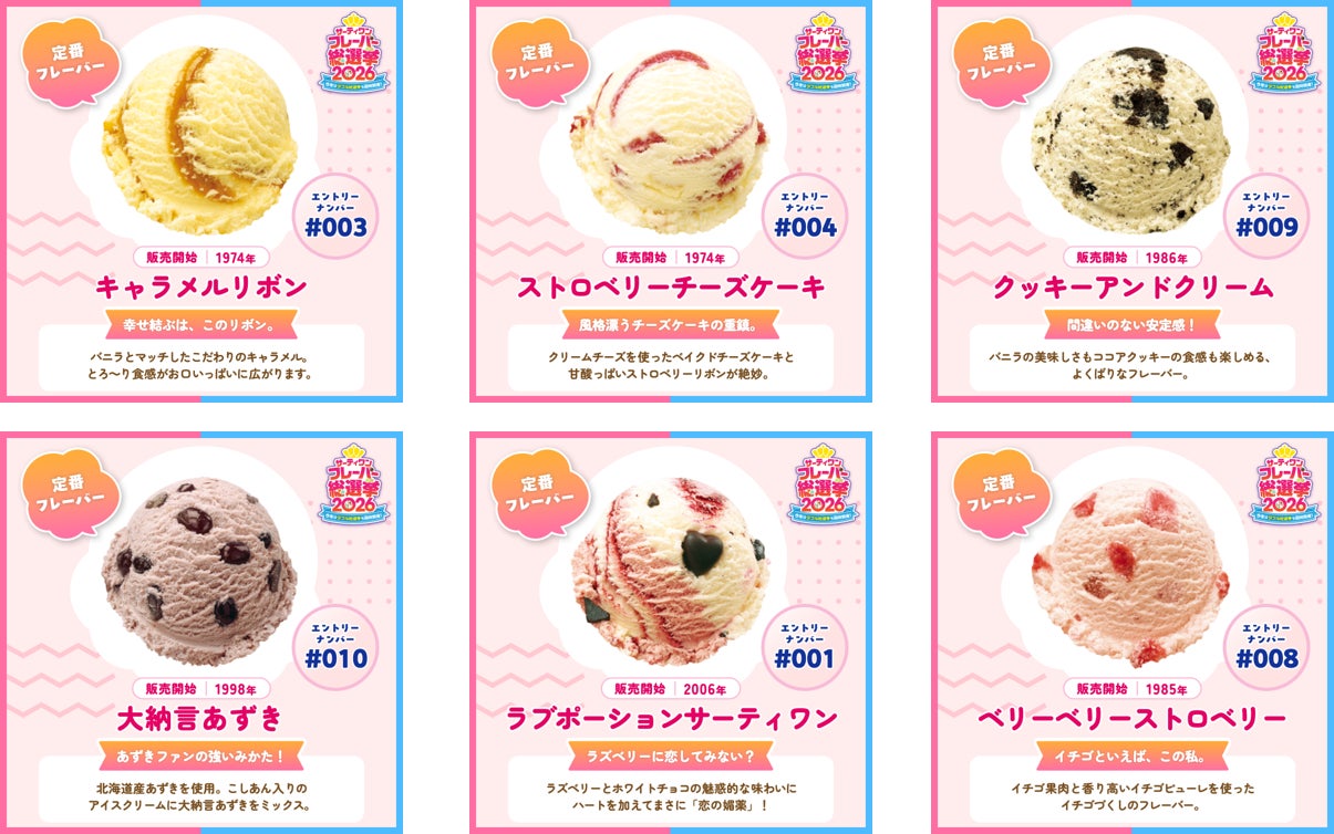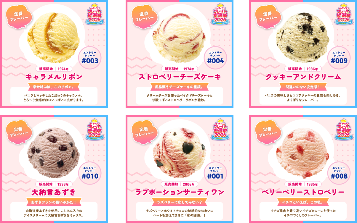 おなじみの定番フレーバーからは、18種類がエントリー。50年以上販売している「キャラメルリボン」や「ストロベリーチーズケーキ」、年間販売数第2位(※2025年タブ出荷本数実績)の「クッキーアンドクリーム」、日本オリジナルの「大納言あずき」、前回のフレーバー総選挙で栄えある1位に輝いた「ラブポーションサーティワン」ももちろんエントリーしています。