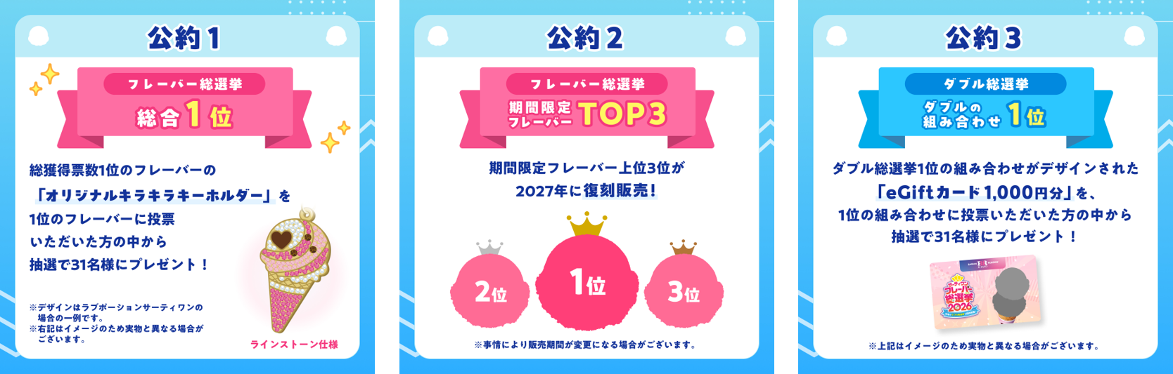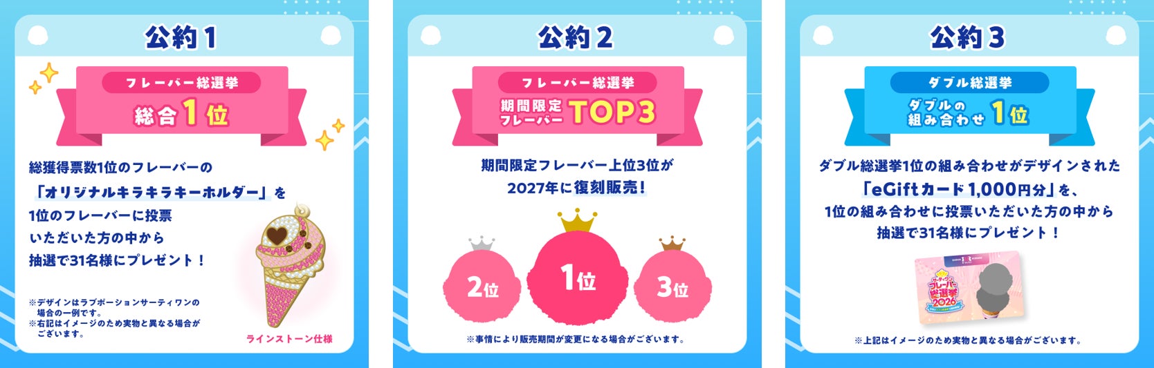 「総合1位」「期間限定フレーバーTOP3」「ダブルの組み合わせ1位」に輝いたフレーバーに対して、プレゼントや復刻販売など、うれしい企画をご用意しています。