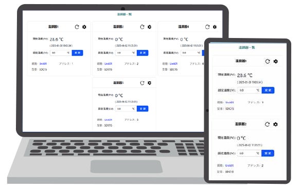 各温調器からの温度データを、ブラウザに一覧表示。離れた場所の温度の状況をまとめて、リアルタイムに確認できます。