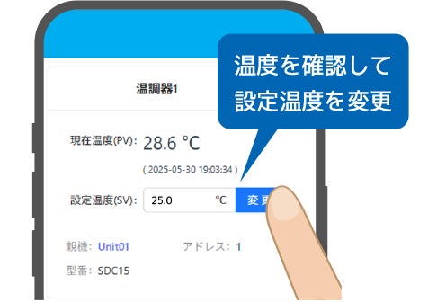 スマートフォンやパソコンから、温調器の設定温度を変更できます。現在の計測温度と設定値を確認し、手元で変更操作。温度が急変した際にも現場に赴くことなく、温度の状況を確認しながら臨機応変に設定調整することが可能です。