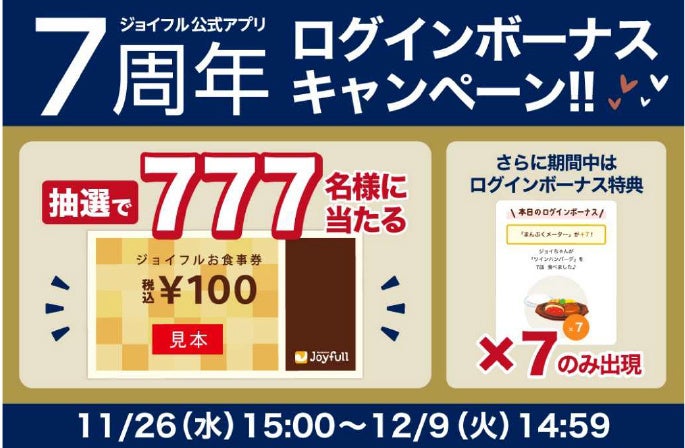 内容:①ログインボーナス特典が「+7」のみ出現します。 ②期間中、9日間以上アプリにログインした方の中から抽選777名様に、デジタルお食事券をプレゼント。※お食事券の有効期限は2026年1月31日(土)23時59分