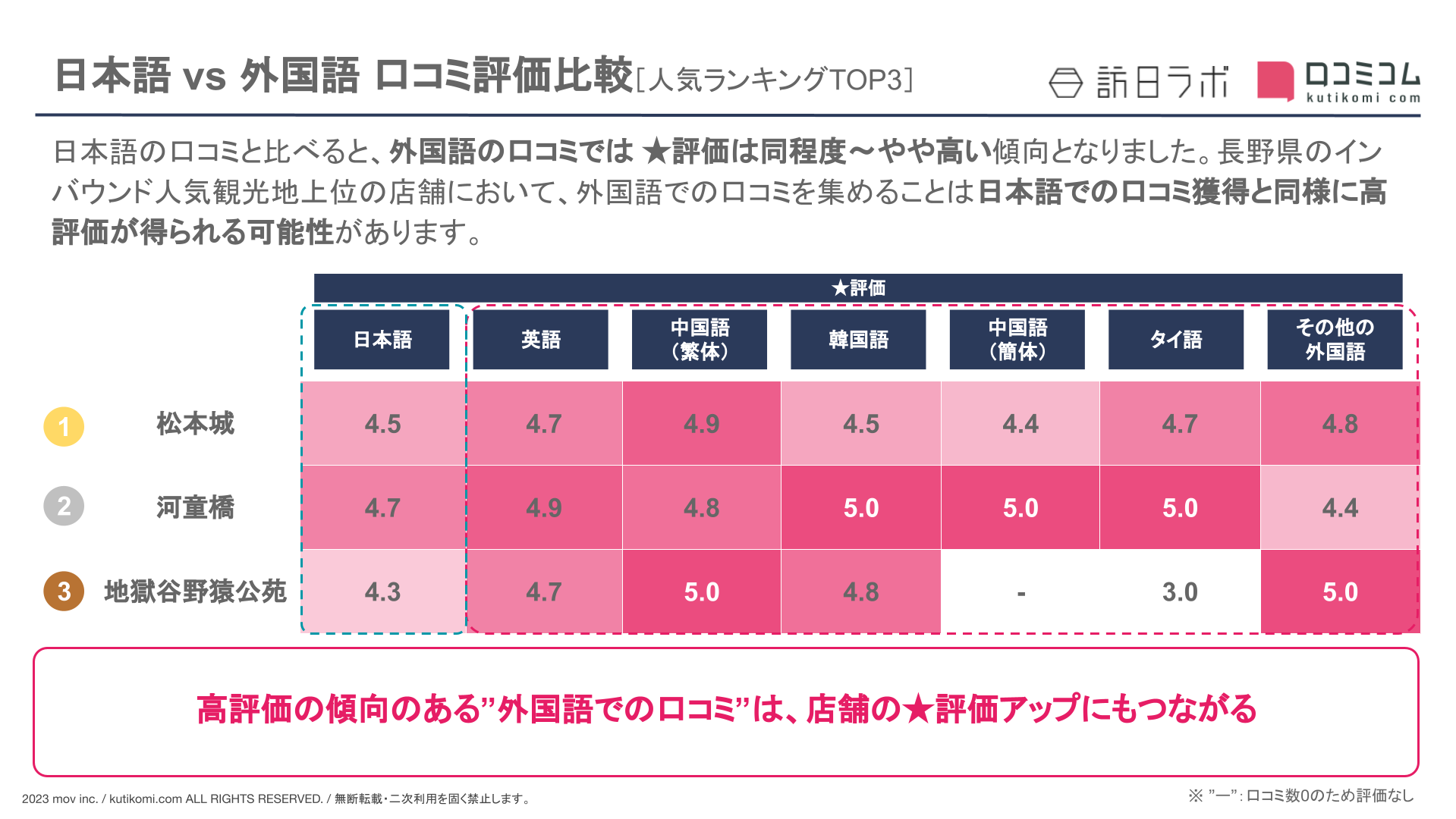 日本語の口コミと比べると、外国語の口コミでは ★評価は同程度〜やや高い結果となりました。長野県のインバウンド人気観光地上位の店舗において、外国語での口コミを集めることは日本語での口コミ獲得と同様に高評価が得られる可能性があります。