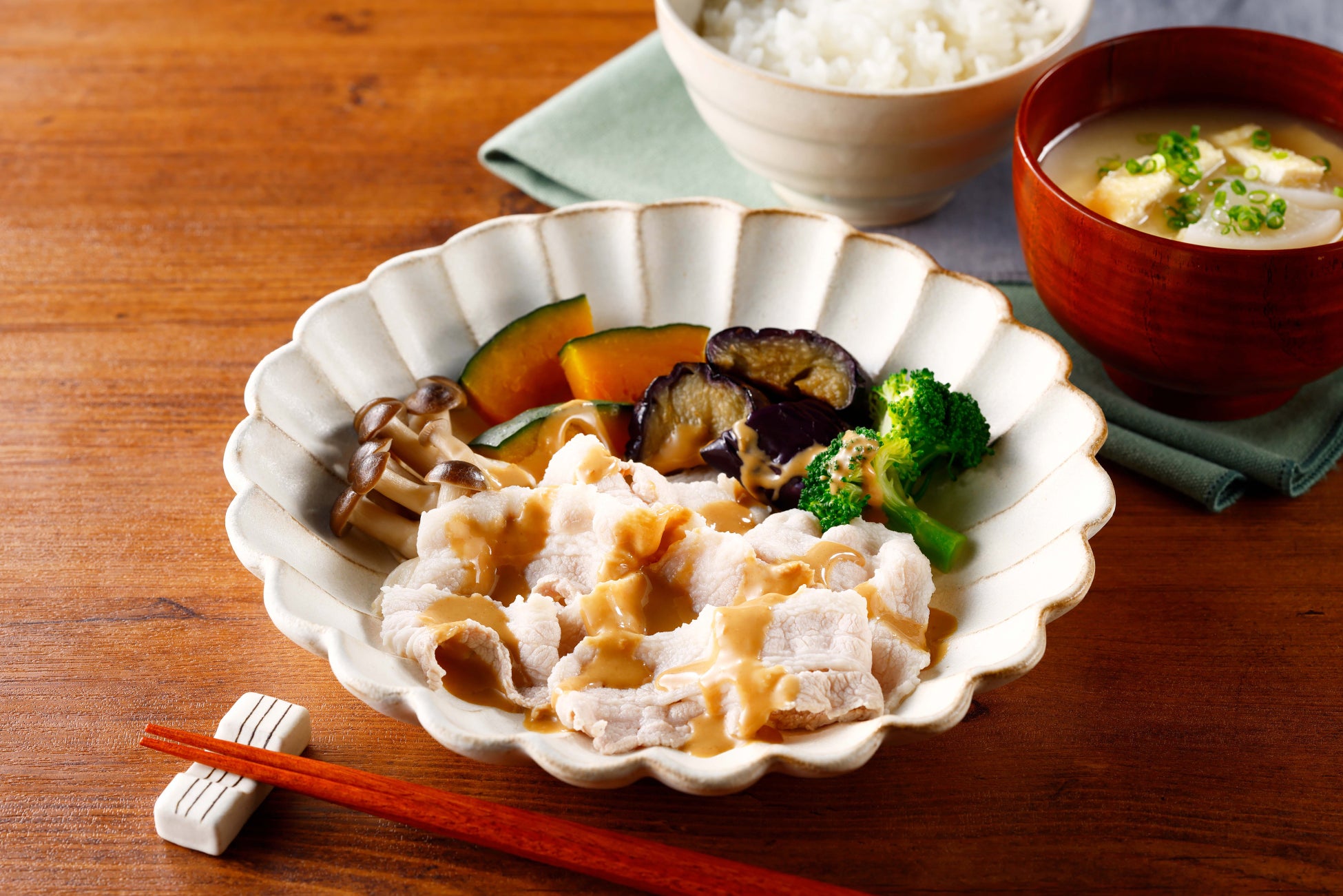 落花生をたっぷり入れた芳醇な煎りごまソースで和えた季節野菜と豚肉の贅沢な一品です。
