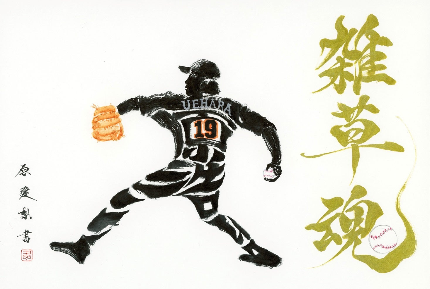 「上原浩治」の文字を使って投球フォームを描いた作品
