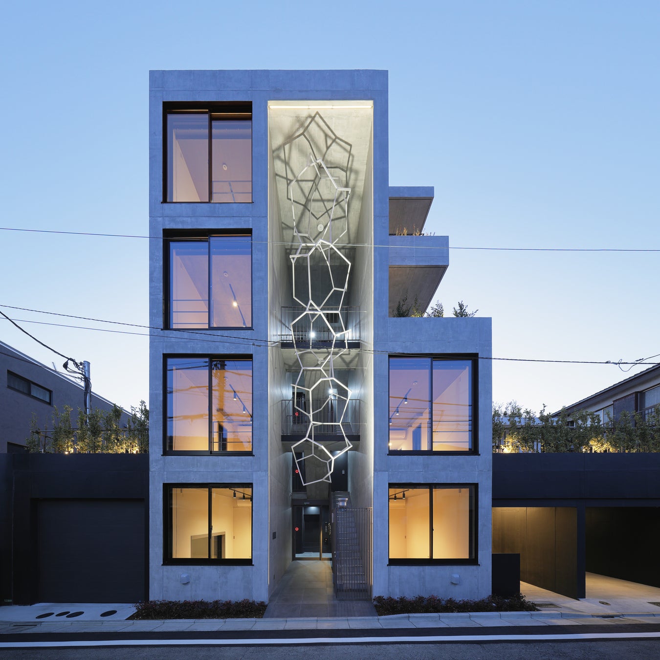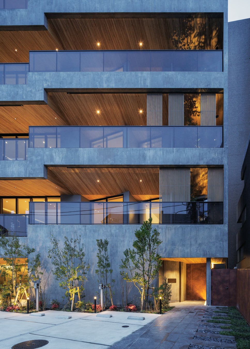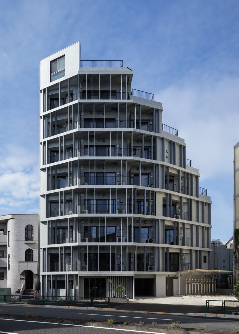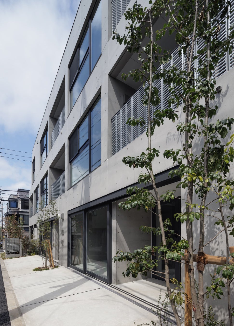 奥沢という地域の持つ穏やかな環境と都市的な利便性を融合させた集合住宅である。敷地は呑川の河岸段丘上に位置し、目黒台への開けた眺望を活かした設計が特徴的である。各住戸には風景を絵画のように切り取るピクチャーウインドウが設けられ、自然とのつながりを感じられる空間が創出されている。住戸は6戸に限定されており、すべて異なるプランが採用されている。多方向に開口部を設けることで、光や風の移ろいを室内に取り込み、漆喰などの自然素材を用いた内装が、居住者に穏やかな心地よさをもたらす。ビルトインガレージやルーフトップテラスなど、屋内外の連続性を意識した構成も魅力の一つである。また、エントランスホールには東京藝大との連携により現代アートが常設展示されており、住民の日常のみならず、周囲の人々にも芸術に触れる機会が提供されている。短期的な効率を追求するのではなく、建築家との協働により長期的な視点で設計された本プロジェクトは、地域の資産価値向上にも寄与する可能性を秘めている。