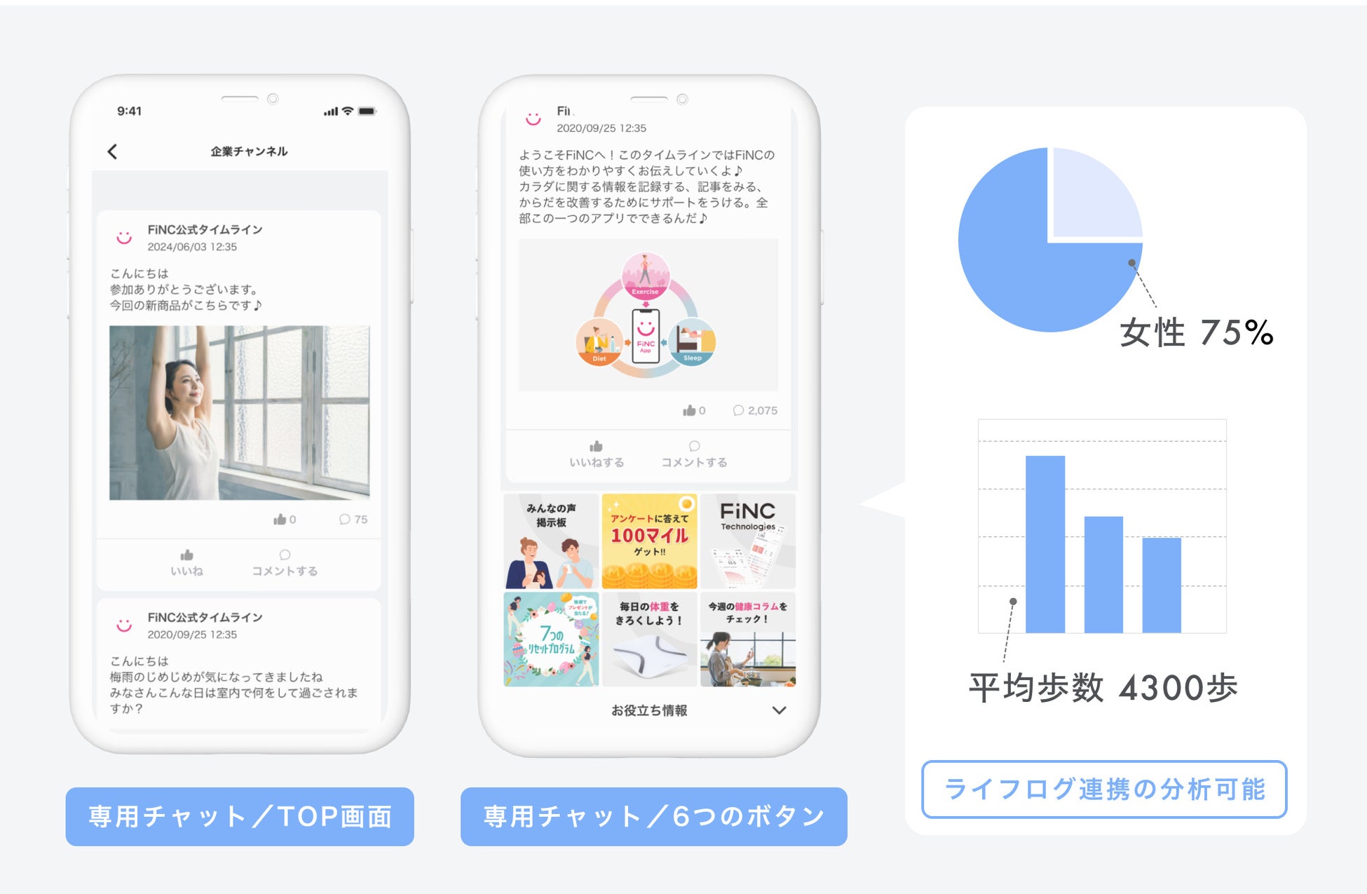 これにより、新商品の先行公開、既存商品の深掘り(利用ユーザーの生活記録を掛け算した分析)、ポイント(FiNC マイル)付きで自社Web サイトへの誘導など幅広く利用できます。かつ、簡易CRM 的に企業単位で囲い込めるため、継続的に同ユーザーに接触可能です。FiNC アプリ内に、自社商品に興味があるユーザーを、ライフログ付きで顧客管理できるシステムです。