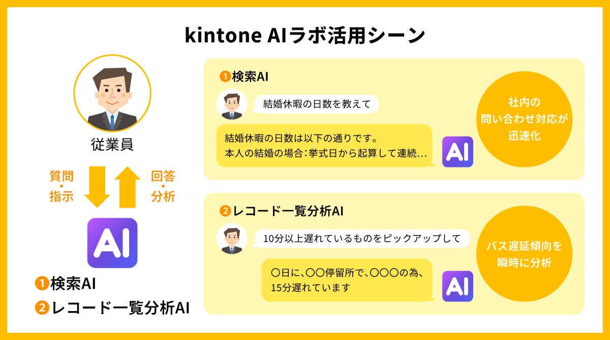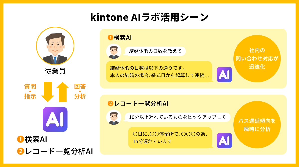 国際興業は、kintoneアプリに登録されたデータから適切な回答を検索して表示する「検索AI」を用いて、2種類の仕組みを実現しました。