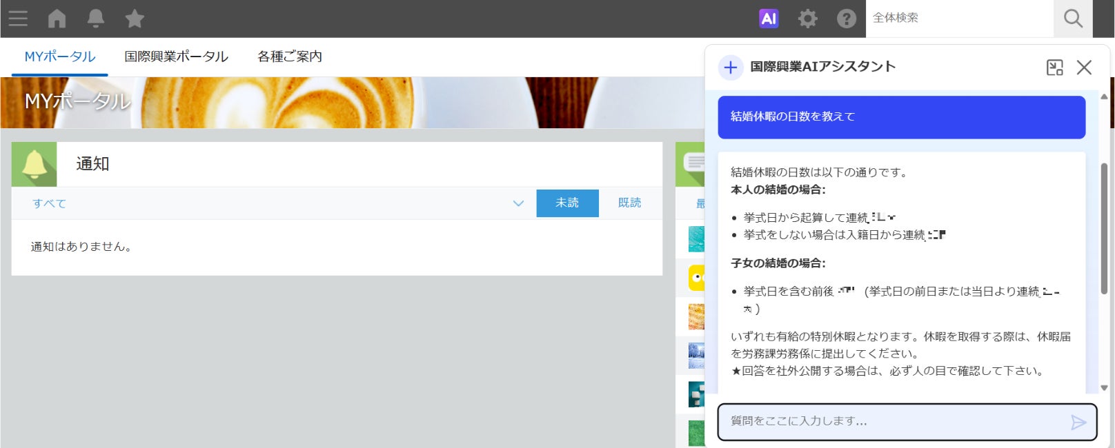 総務部:社内規定や提出書類を参照するアプリに「検索AI」機能を追加。問い合わせを受けた際、従業員が「検索AI」に質問すると、過去の事例や規則に基づいた回答が返ってくることで対応負荷を軽減しました。