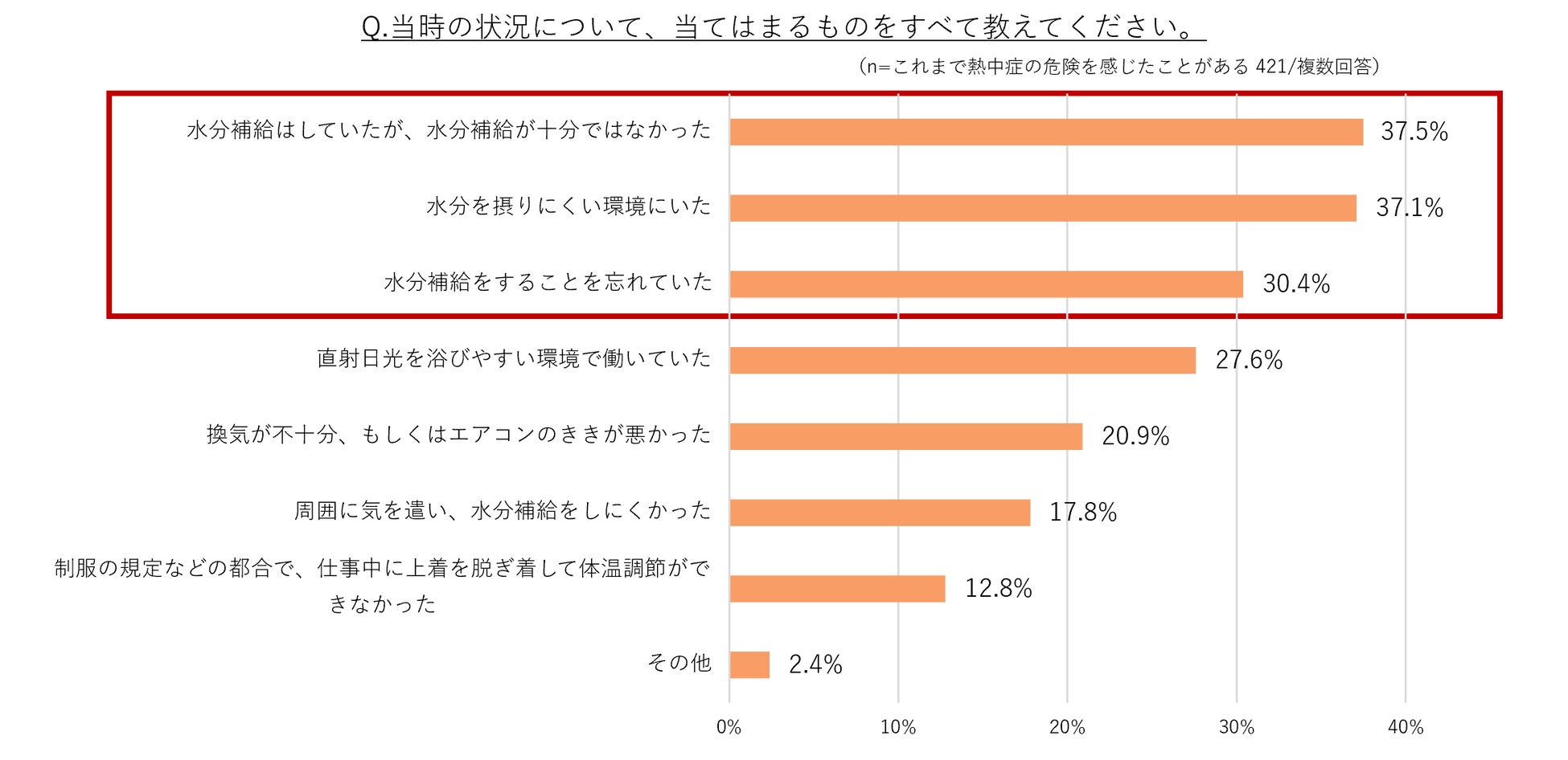 ・熱中症の危険性を感じたことがある人に当時の状況について伺ったところ、「水分補給はしていたが、十分ではなかった」「水分を摂りにくい環境にいた」「水分補給をすることを忘れていた」が上位に。
