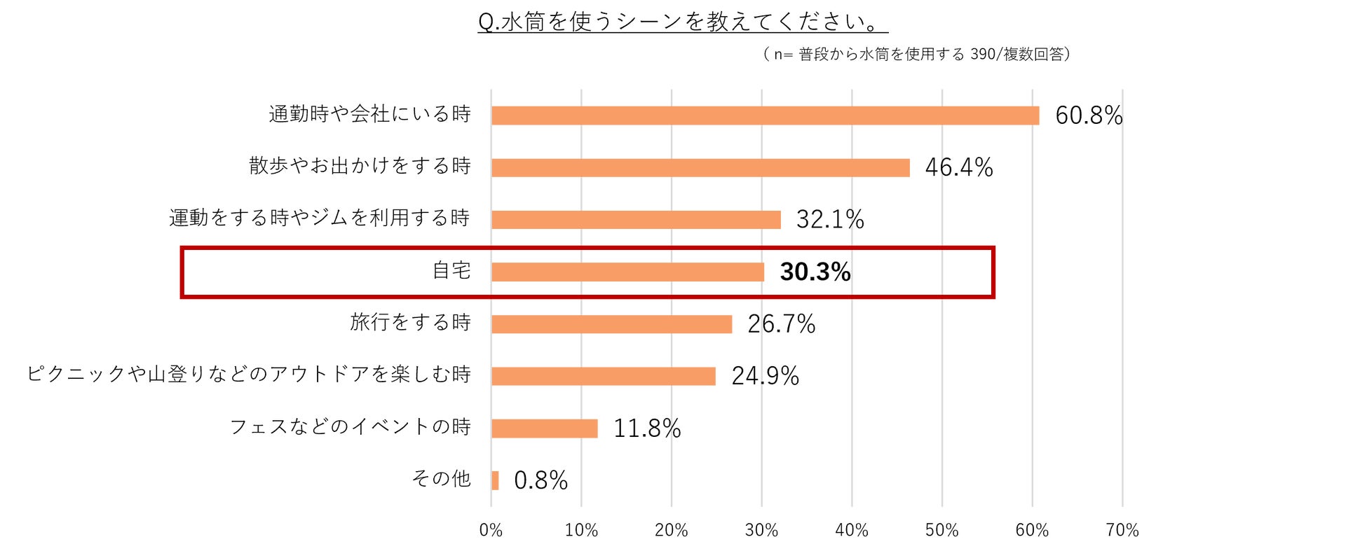 ・普段、水筒を使用している人はおよそ6割越。また水筒を使うシーンは、「通勤時や会社にいる時」と回答した人が最も多く見られました。加えて、およそ3人に1人(30.3%)は「自宅」で使用していることが明らかに。外出先のみならず、室内や日常でもマイボトルの使用が一般的になっている傾向が見られました。