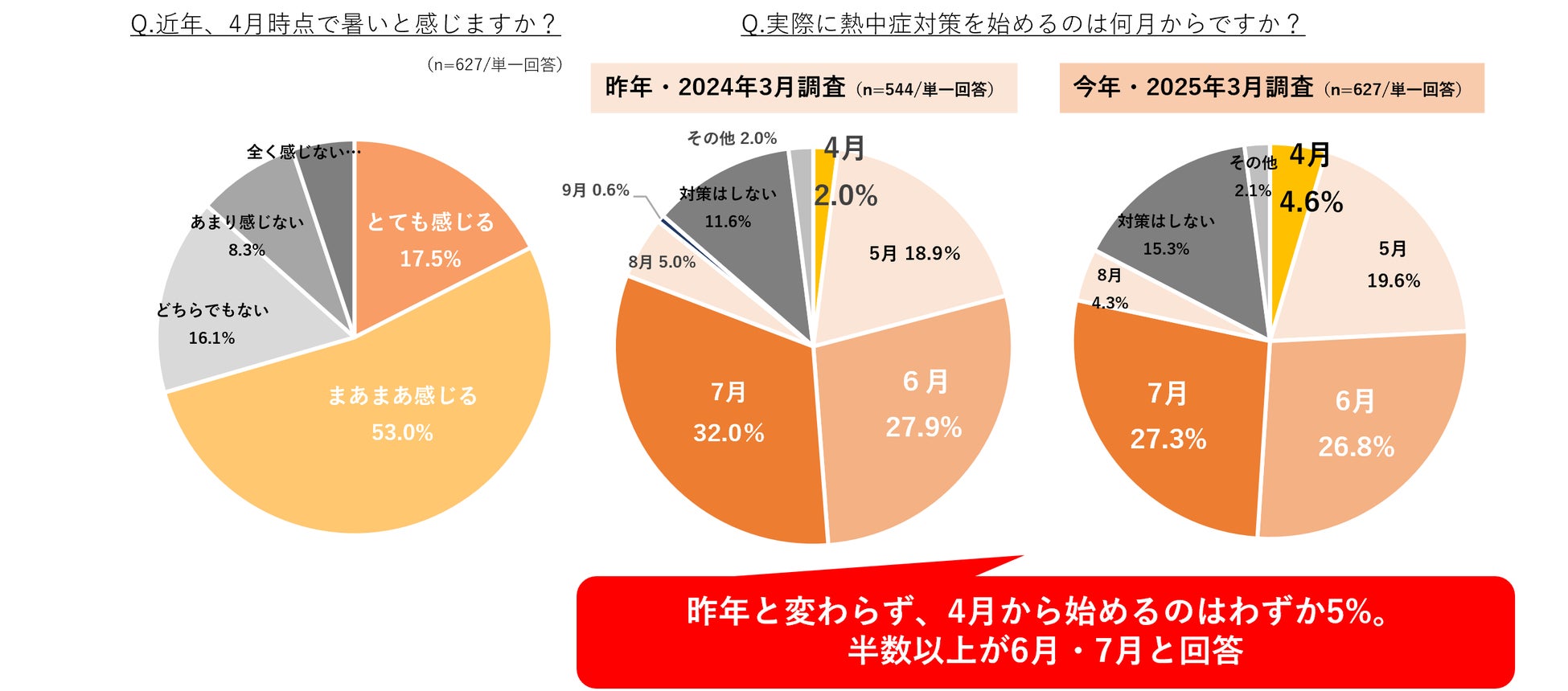 4月時点で暑いと感じる人は7割超の一方、4月から熱中症対策を開始する人はわずか5%という結果に。昨年と変わらず、「6月」「7月」からと回答した人が全体の半数以上。