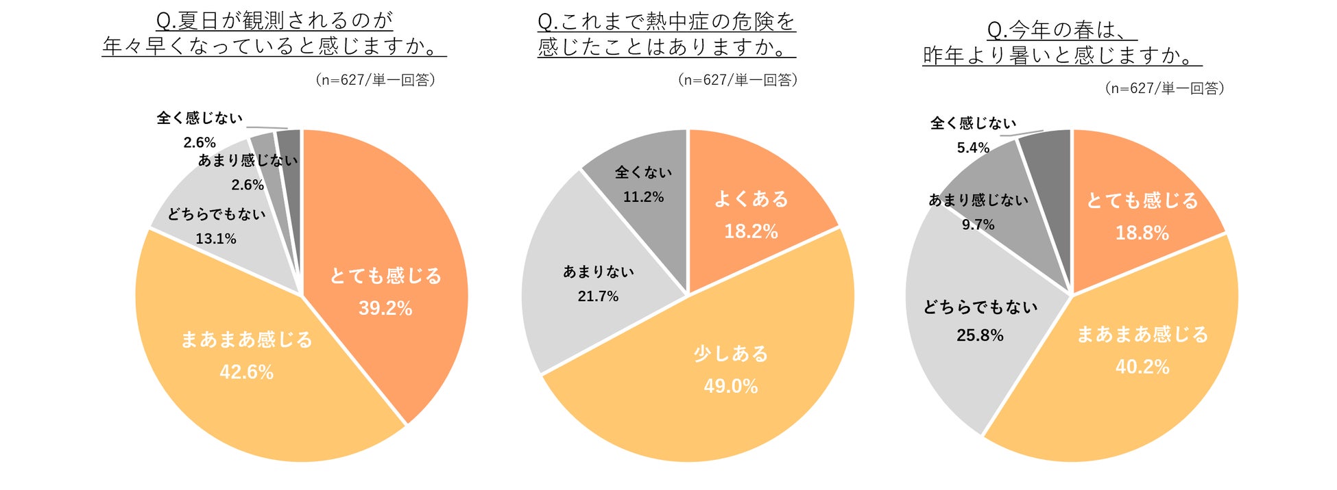 これまでに熱中症の危険を感じたことがある人は約7割(67.2%)。今年の春、昨年より暑いと感じる人は約6割。
