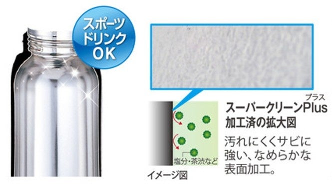 ボトルの内面になめらかで光沢のあるスーパークリーン/スーパークリーンPlus(プラス)加工を施しているのため、汚れやにおいがつきにくく、サビにも強い仕様。また真空断熱構造で、氷が溶けにくく熱中症対策にも役立つ水筒です。