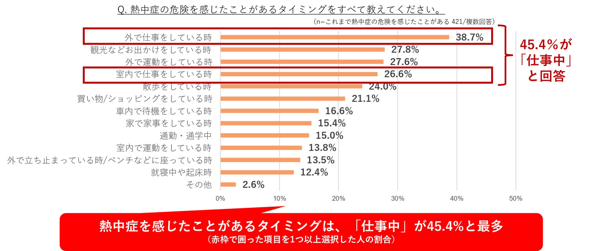 熱中症の危険性を感じたことがあるタイミングは、「仕事中」が最多(45.4%)。室内の仕事でも4人に1人以上が実感。