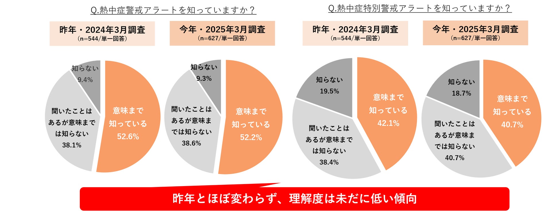 「熱中症警戒アラート」「熱中症特別警戒アラート」の理解度は昨年とほぼ変わらず、未だに低い傾向