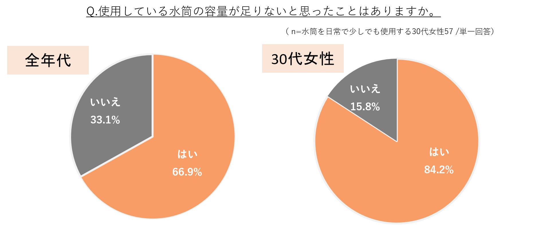 使用している水筒の容量が足りないと思ったことがある人は66.9%も。30代女性は8割以上が実感。