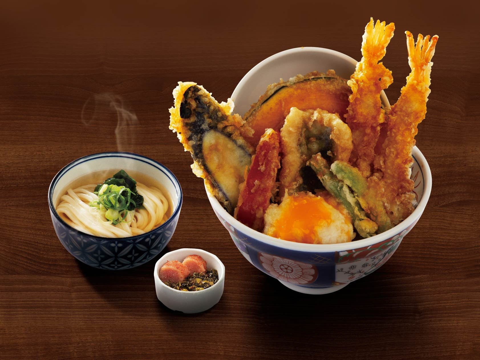 サクッと揚げたての鱧、夏野菜、海老、とろーり半熟卵を盛り付けた期間限定上天丼セットです。