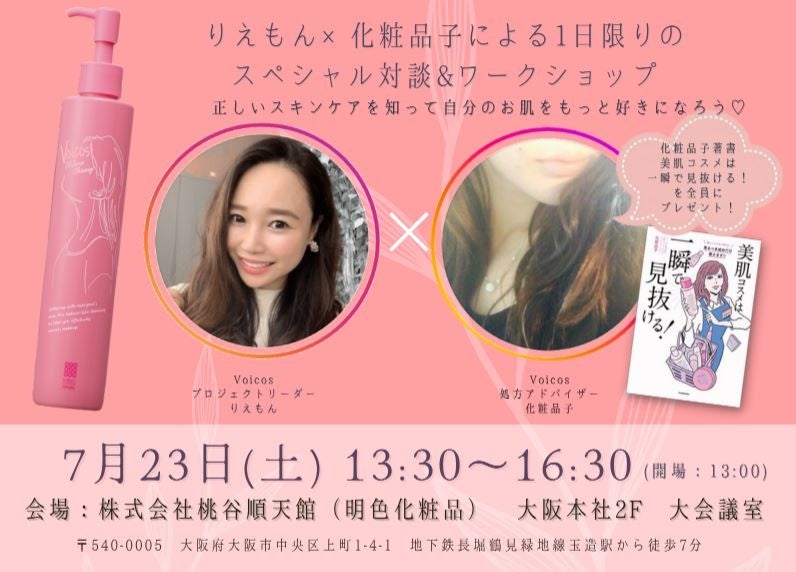 明色化粧品の新商品「Voicos(ヴォイコス)オイル セラム クレンジング」の発案から開発まで携わった、SNSコンサルタントのりえもんさんと、「美肌コスメは一瞬で見抜ける」の著者である化粧品子(けしょうひんこ)さんによるスペシャル対談やワークショップを体験できるリアルイベントです。