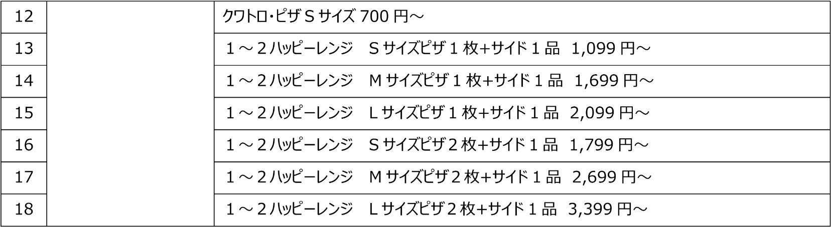 ※「クワトロ・ピザSサイズ700円」は、1ハッピーレンジSサイズピザの価格です。Mサイズへの変更は+300円、Lサイズへの変更は+600円、2ハッピーレンジのピザは+200円、3ハッピーレンジのピザは+300円、4ハッピーレンジのピザ+400円でアップグレードを承ります。