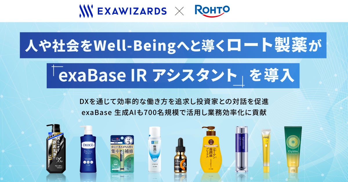 株式会社エクサウィザーズのグループ会社である株式会社Exa Enterprise AI(東京都港区、代表取締役:大植 択真、以下Exa Enterprise AI)は、ロート製薬株式会社(以下ロート製薬)が当社の「exaBase IRアシスタント」を導入したことをお知らせします。ロート製薬は、業務特化型の生成AIを経営企画部など、株主・投資家向けの情報開示に関係する部門で活用することで担当者の業務DXを推進し、付加価値の高い情報開示や投資家との対話へと注力できる体制の実現を図ります。また、ロート製薬では700名以上の社員に「exaBase 生成AI」を導入しており、日常発生する要約や翻訳、原稿作成など幅広い業務の効率化に寄与しています。