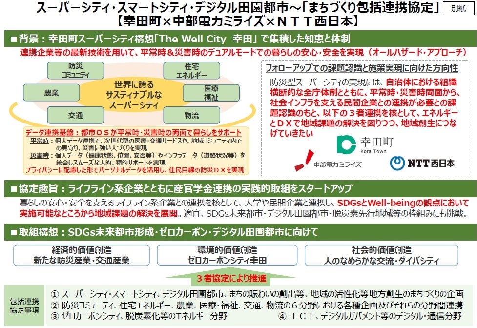 幸田町(町長:成瀬 敦)、中部電力ミライズ株式会社(代表取締役:大谷 真哉、以下「中部電力ミライズ」)、および西日本電信電話株式会社東海支店(執行役員 東海支店長:安部 真弘、以下「NTT西日本」)は、本日、「まちづくり包括連携に関する協定」を締結いたしました。
