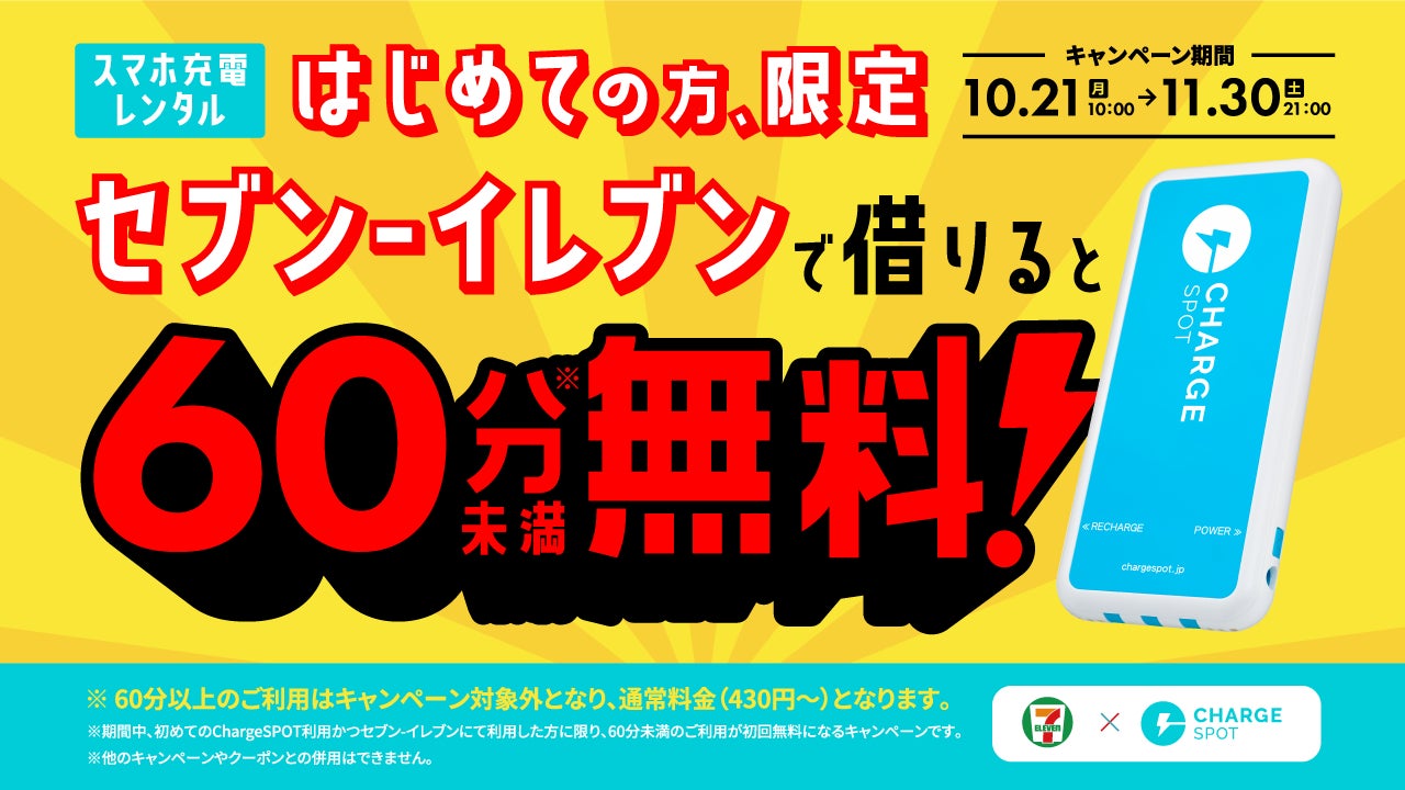 「ChargeSPOTをはじめての方限定、セブン-イレブンで借りると60分無料キャンペーン」を10月21日(月)より実施