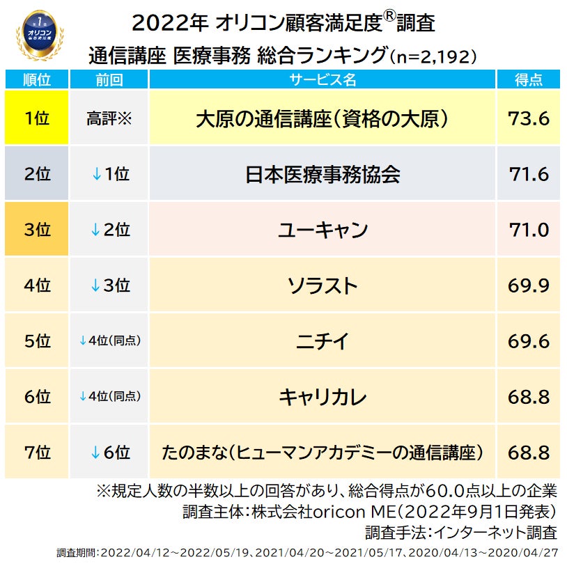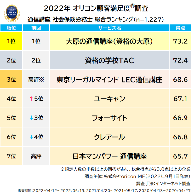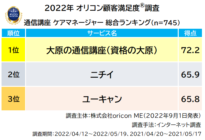 2022年最新『通信講座(行政書士/社会保険労務士/医療事務/ケアマネジャー)』ランキング(オリコン顧客満足度®調査)