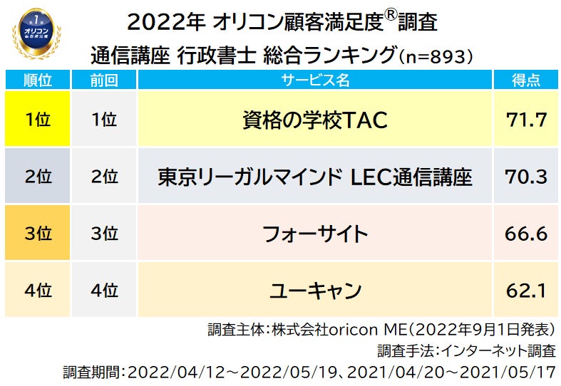- <行政書士>【資格の学校TAC】が2年連続総合1位
