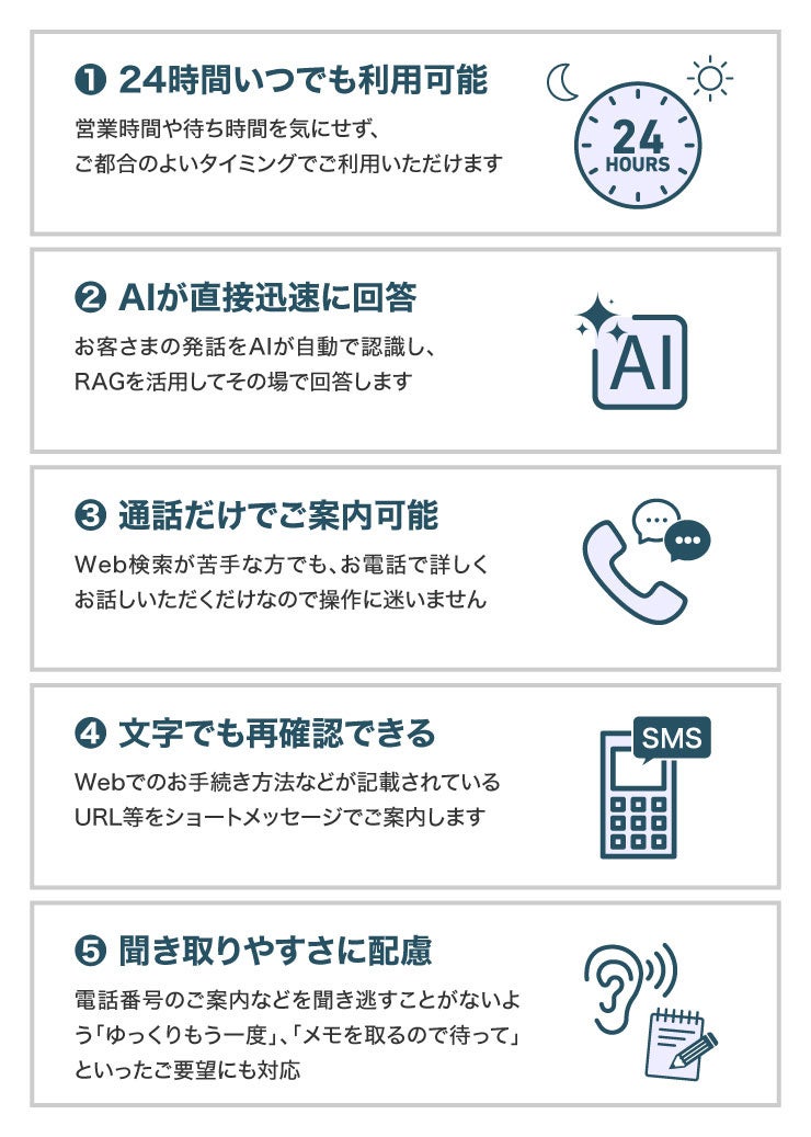 昨今、Webサイト上でのお手続きが主流となる中、「電話で直接確認しながら、疑問点を解決したい」「Webサイトでの確認では疑問が残るが、電話をかけるほどではない」というお客さまからのニーズは、依然として根強く存在しています。一方で、有人オペレーターによるカスタマーセンターでは、「お電話の繋がりにくさ」や「受付時間の制約」といった構造的な課題があり、お客さま体験(CX)向上の障壁となっていました。