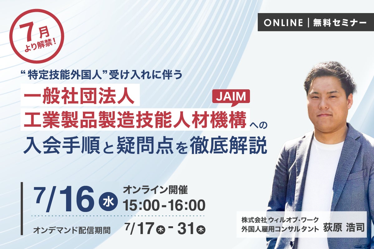 ウィルグループの総合人材サービスを手掛ける株式会社ウィルオブ・ワーク(本社:東京都新宿区、代表取締役社長:村上 秀夫)は、無料オンラインセミナー『7月より解禁! 特定技能外国人受け入れに伴う一般社団法人工業製品製造技能人材機構「JAIM」への入会手順と疑問点を徹底解説!』を、2025年7月16日(水)に開催します。