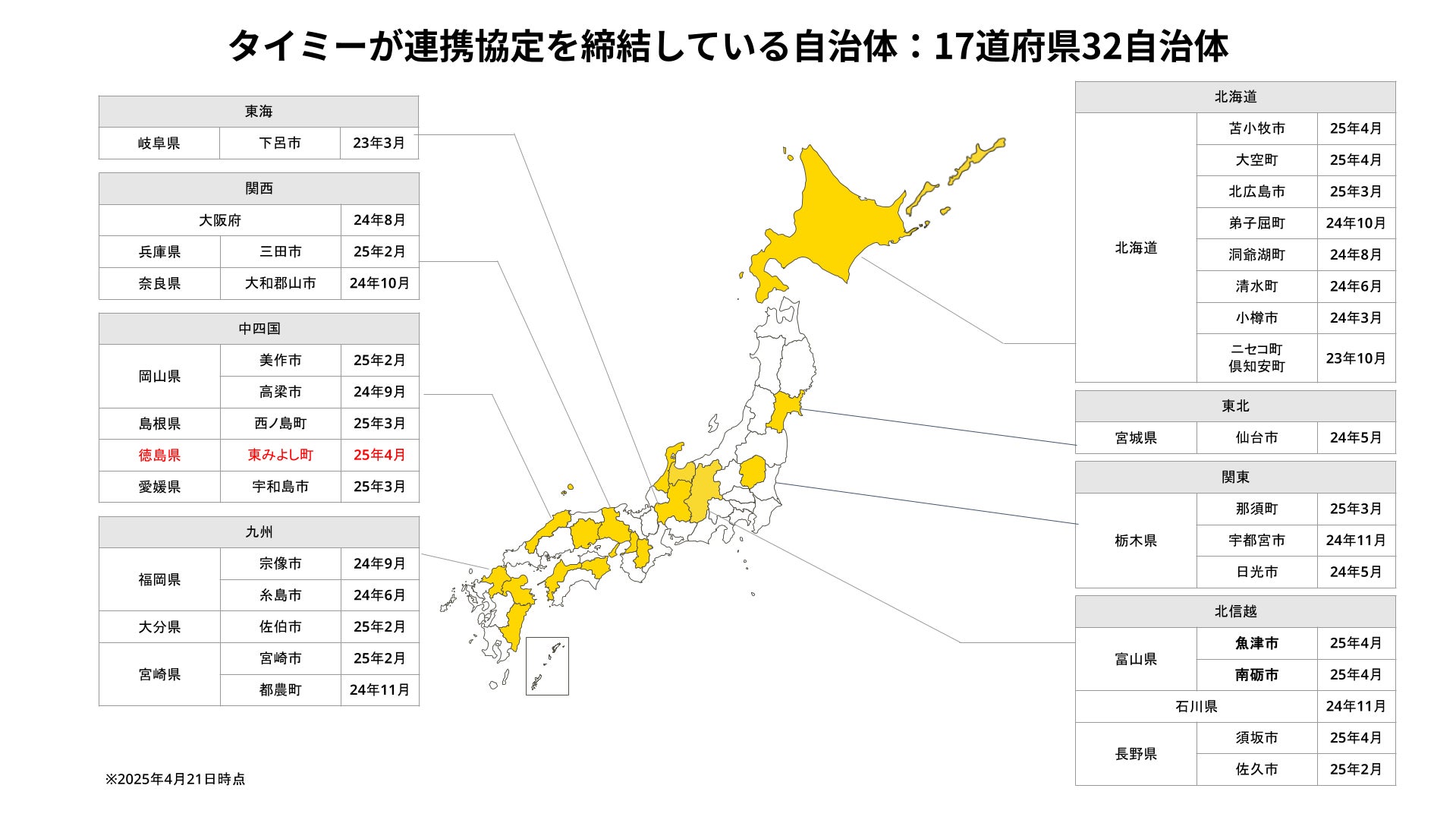 当社はこれまで16道府県・31自治体と連携協定を締結しており、今回の東みよし町との連携は17道府県・32自治体目となります(※2)。なお徳島県における自治体連携は、今回が初となります。
