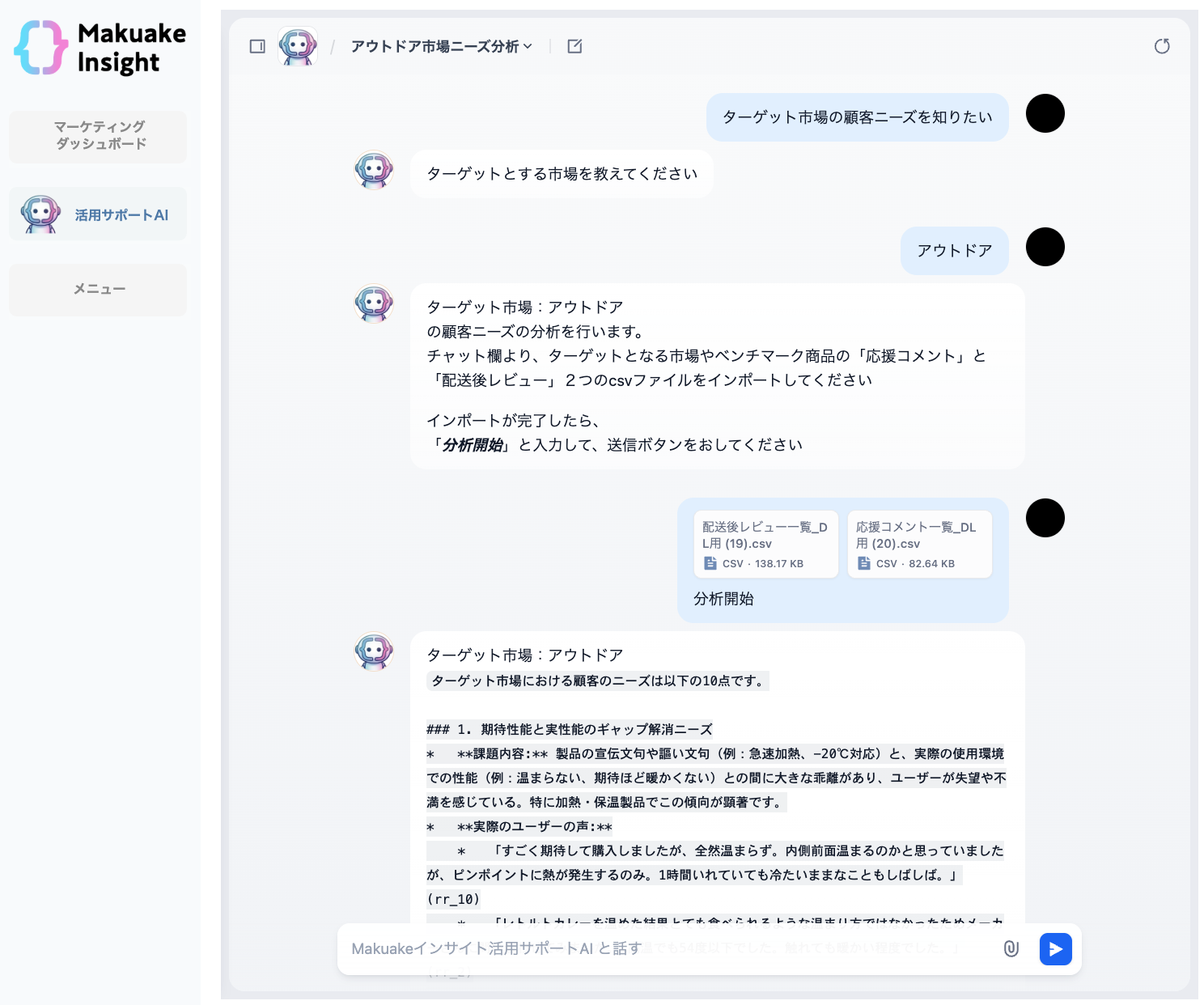 今回搭載したAI機能は、まずAIチャットボットが実行者にヒアリングを行った上で、「Makuake」で蓄積してきた膨大な行動データや応援コメント、配送後レビューによる回答といった生活者の声を元に、企画のヒントを瞬時に整理・抽出します。