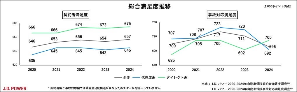 契約者の満足度を総合的に聴取する「J.D. パワー 自動車保険契約者満足度調査℠」では、2012年*² の調査以来、ダイレクト系の総合満足度が代理店系を上回っていたが、事故対応における満足度を聴取する本調査においてダイレクト系の総合満足度が代理店系を上回る結果となったのは2012年以降初めてである。