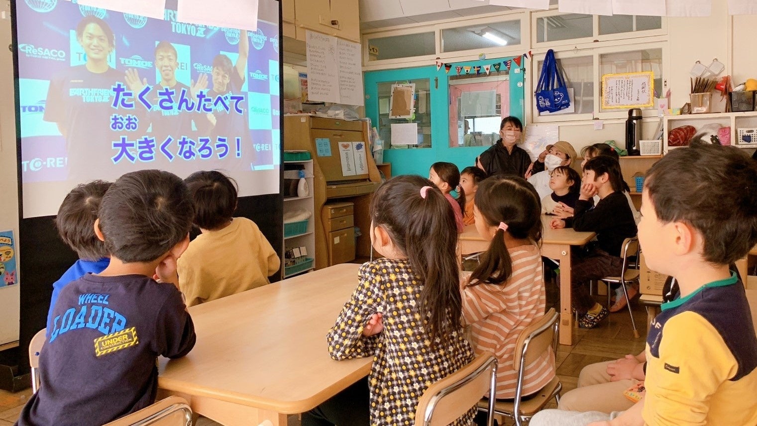 株式会社あしたばマインド(東京都港区、社長執行役員:杉原 吉徳)が運営する明日葉保育園では21日、プロバスケットボールチーム「アースフレンズ東京Z」と協同の食育プログラムを実施しました。園児たちはバスケのドリブルやシュートに挑戦したあと、選手と栄養士が開発したコラボ給食を喫食。給食の前には、選手が出演するオリジナル動画と栄養士からの授業によって、給食に含まれる栄養素や三色食品群について学びました。