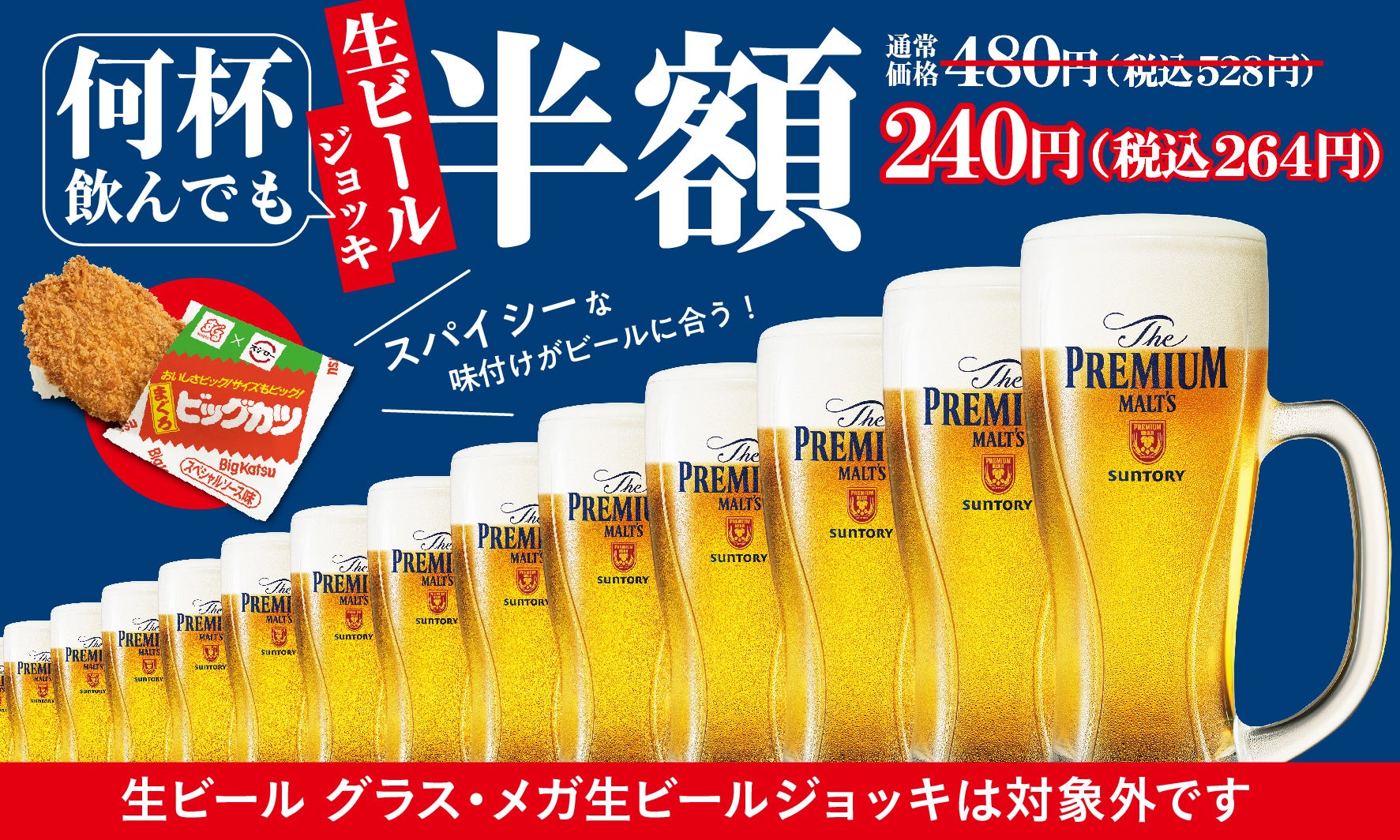 同日より、期間限定で「生ビール ジョッキ」を半額でご提供しておりますので、ぜひ「まぐろビッグカツ」と一緒にお楽しみください。