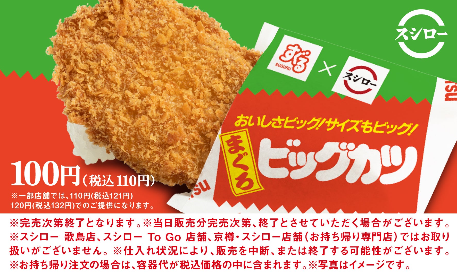 株式会社あきんどスシロー(本社:大阪府吹田市、代表取締役社長:新居 耕平)は、株式会社 すぐる(本社:広島県呉市、代表取締役社長:大塩 俊)の累計5億食以上販売するロングセラー商品「ビッグカツ」とコラボし、「まぐろビッグカツ」を7月13日(水)より、全国のスシロー(※1)にて期間限定で販売いたします。さらに、同日より期間限定で「生ビール ジョッキ」を半額でご提供いたします。