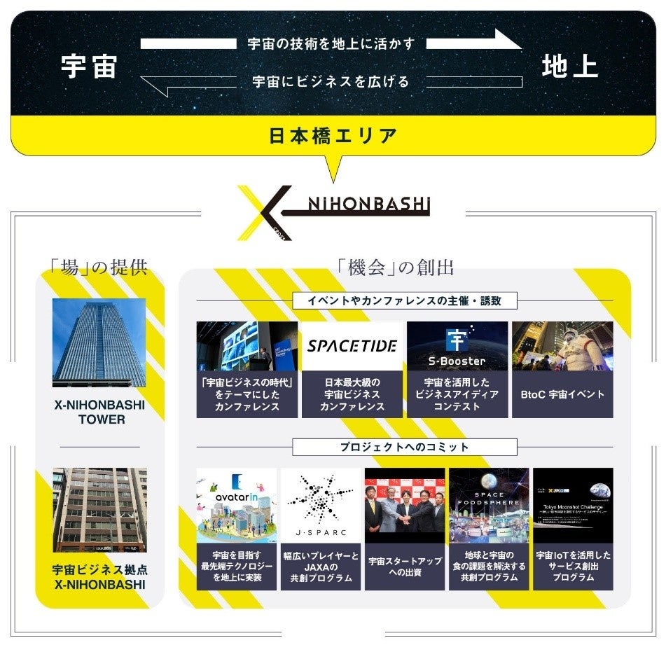 「X-NIHONBASHI」は、日本橋の街において、三井不動産が推進する、「場」の提供と「機会」の創出を通じて宇宙関連領域のビジネス拡大に貢献し、そこに集まる産・学・官の多様なプレイヤーとの 共創活動を推進することで、地上においてもイノベーションを起こしていく一連のプロジェクトです。