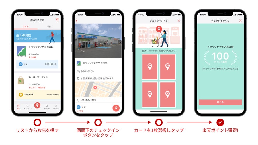 利用者は店内の指定エリアで「楽天チェック」アプリを起動しチェックインすると、くじ形式でもれなく1ポイントから最大100ポイントの「楽天ポイント」を獲得することができるようになります。