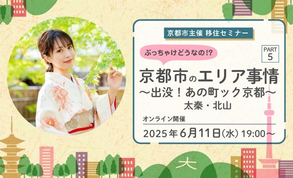 令和7年度の第1回移住セミナーは、「ぶっちゃけどうなの!?京都市のエリア事情 PART5 ~太秦・北山編~」と題し、昨年度の移住セミナーで大好評を博したエリア情報をさらに深掘りし、右京区の太秦エリア及び北区・左京区にまたがる北山エリアの魅力を、オンラインでお届けします。