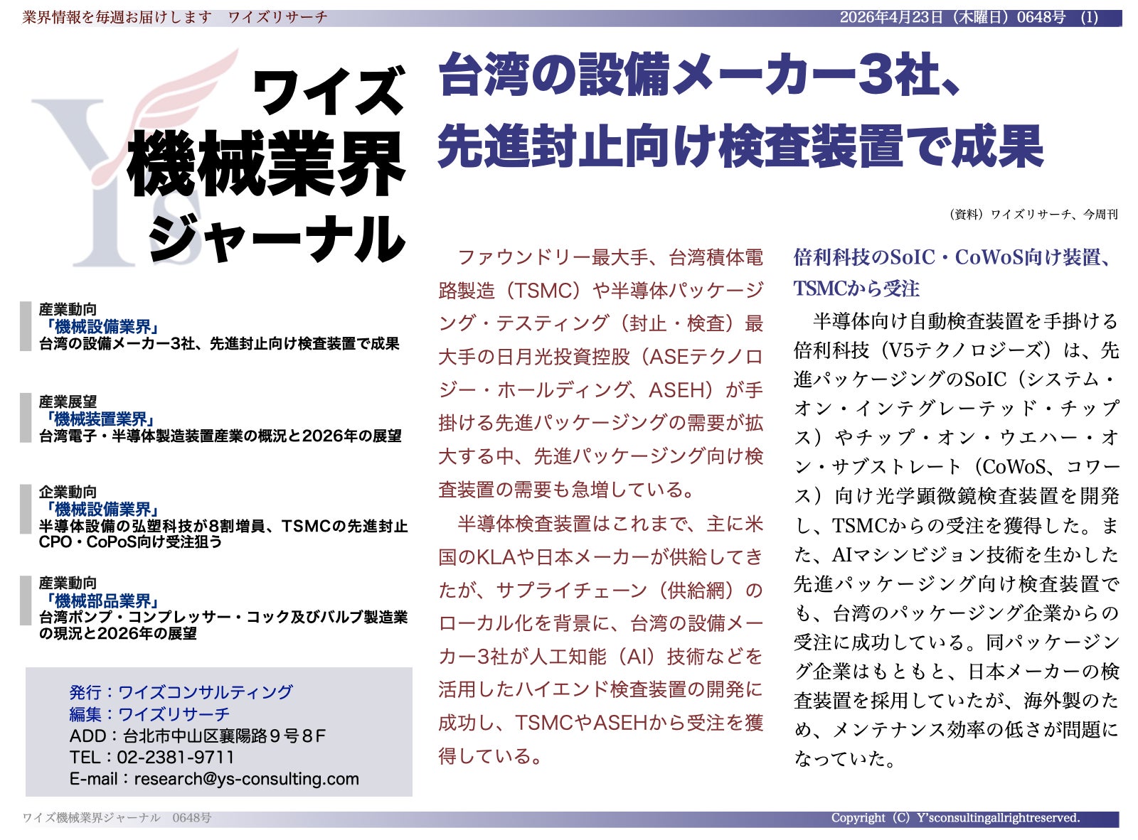 ワイズコンサルティング グループ(本社:中華民国台北市、代表取締役:吉本康志)は台湾機械業界専門誌「ワイズ機械業界ジャーナル」の2026年4月第4週号を発行しました。