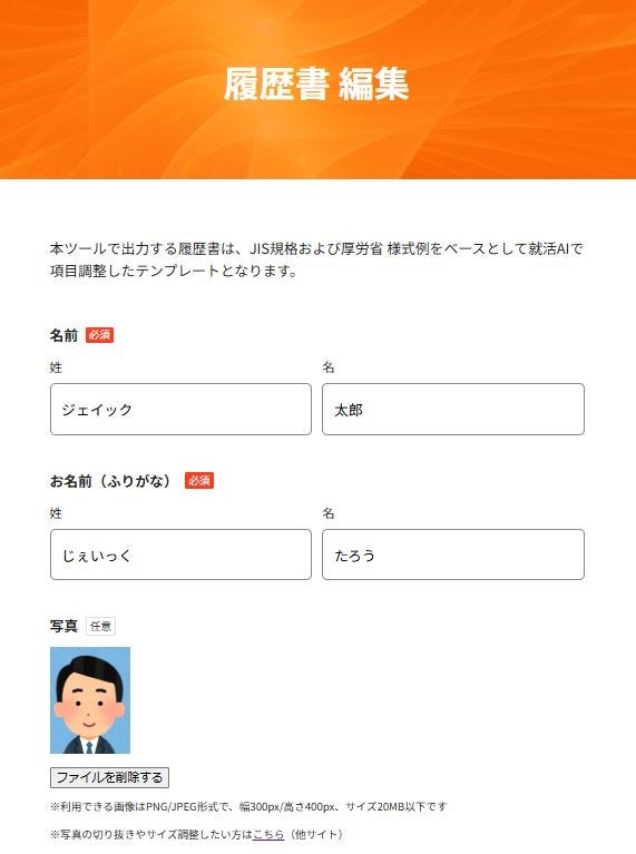 ※本ツールで出力する履歴書は、JIS規格および厚生労働省の様式例をベースとして就活AIで項目調整したテンプレートとなります。