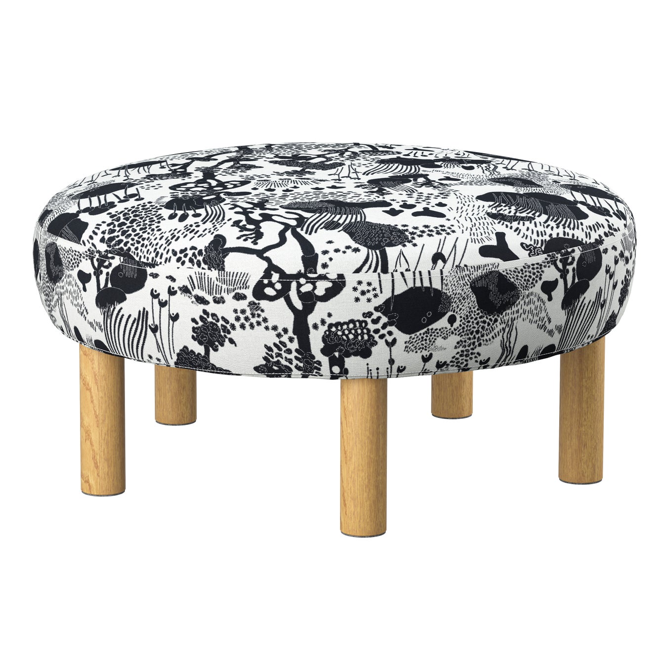 美しい模様とエレガントながらも遊び心のあるスタイルが特徴で、大型サイズなので、ゆったり座ったり足をのせたり、トレイを置いてコーヒーテーブル代わりに使ったりできます。カバーは取り外して洗濯機で洗え、軽い風合いで、いろいろなインテリアに合わせやすいです。木目の美しいオーク無垢材製の脚が5本付いているので、安定感のある座り心地で、ぬくもりのあるナチュラルな印象に空間が仕上がります。特徴的なテキスタイルのパターンはストックホルム周辺の森林をインスピレーションにしていて、ホワイトとブラックは秋から冬にかけての季節感を表現しています。