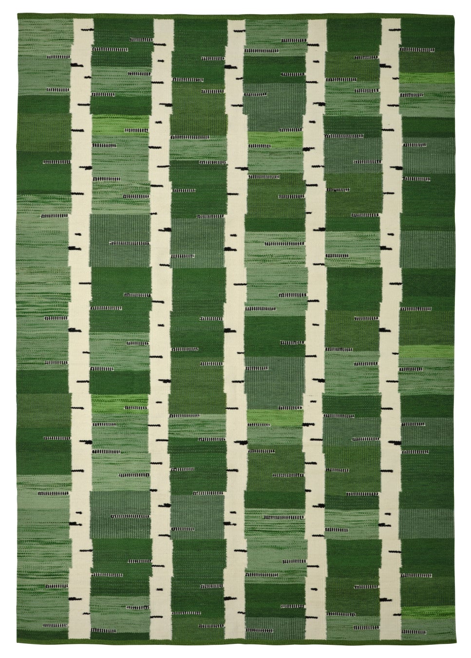 手織りのウールラグは、グレーを背景にシラカバ模様をあしらった美しいデザインです。リバーシブル仕様で、両面ともに同じ美しい模様を楽しむことができます。両面を交互に使うことで、偏ったへたりを防ぎ、長持ちします。表面はフラットで、椅子の出し入れがしやすく、掃除機もスムーズにかけられるため、実用性にも優れています。リビングルームやダイニングルームに最適な一枚です。
