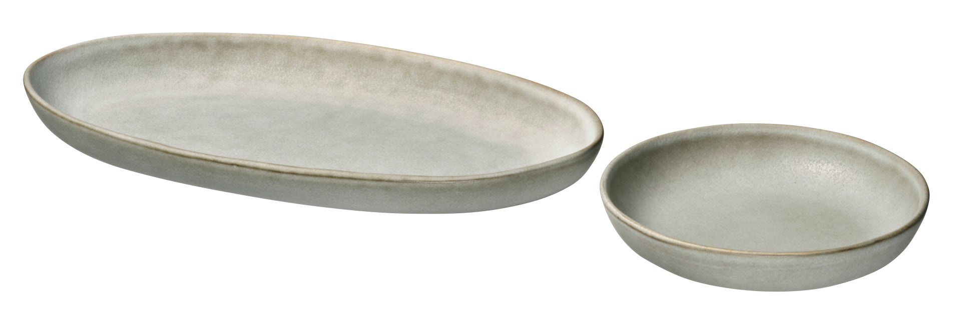 オーバル型と丸型のサイズの違う2種類のプレートのセットで、料理に合わせて使える幅が広がります。小皿料理やさまざまなサイドディッシュを盛り付けるのに最適です。グレーの器が料理を美しく引き立てます。グレーのマット仕上げのせっ器は、石のような素朴でむらのある表面が特徴です。