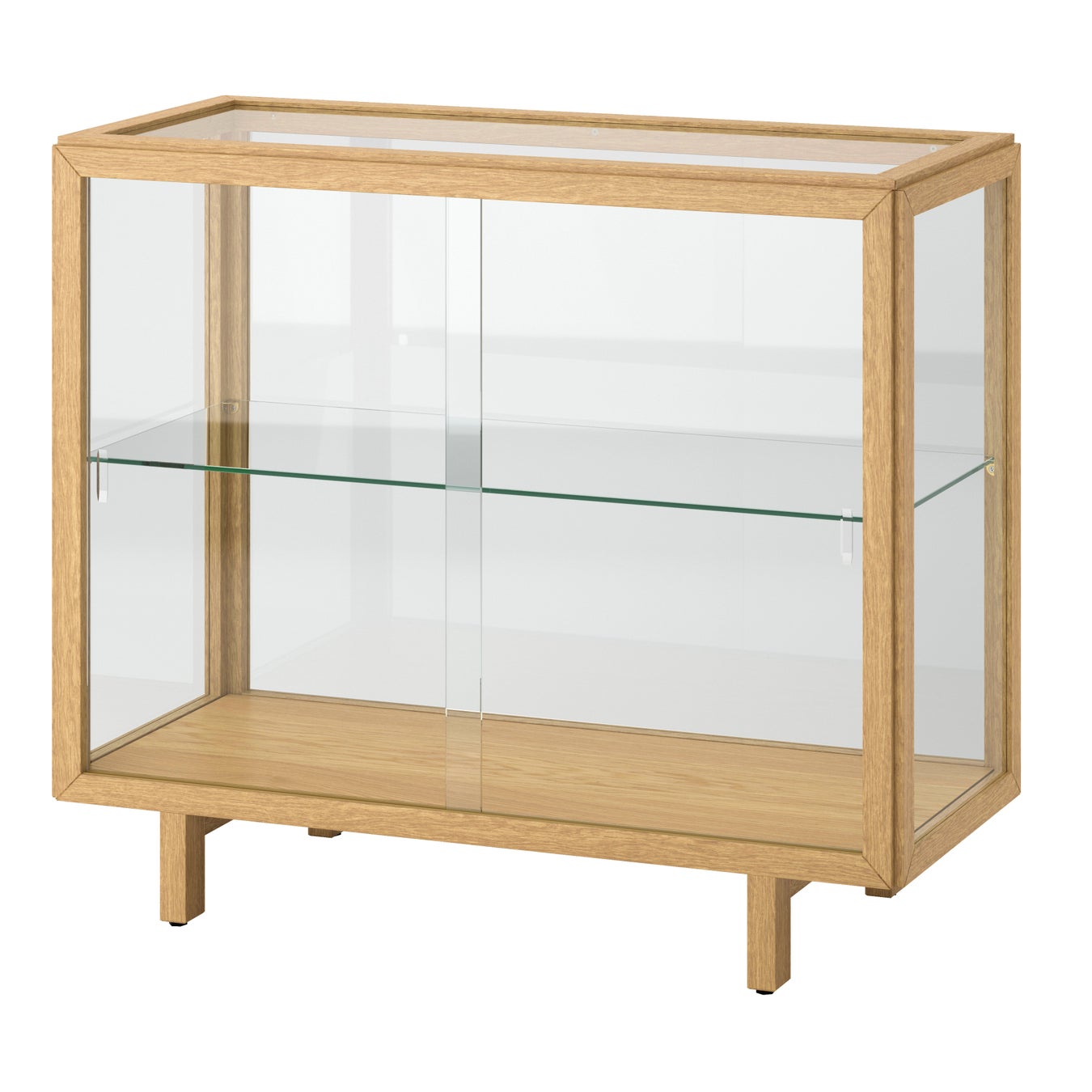 オーク無垢材が洗練された印象を与えるこのキャビネットは、ディスプレイに最適な美しいガラス製です。取っ手はガラスに彫り込むなど、できる限りシンプルなラインでデザインされています。キャビネットの上部はディスプレイ台としても活躍。壁に固定する必要がないため、部屋のどこにでも自由に配置でき、部屋の中央に置けば、お気に入りのアイテムを主役として引き立てることができます。