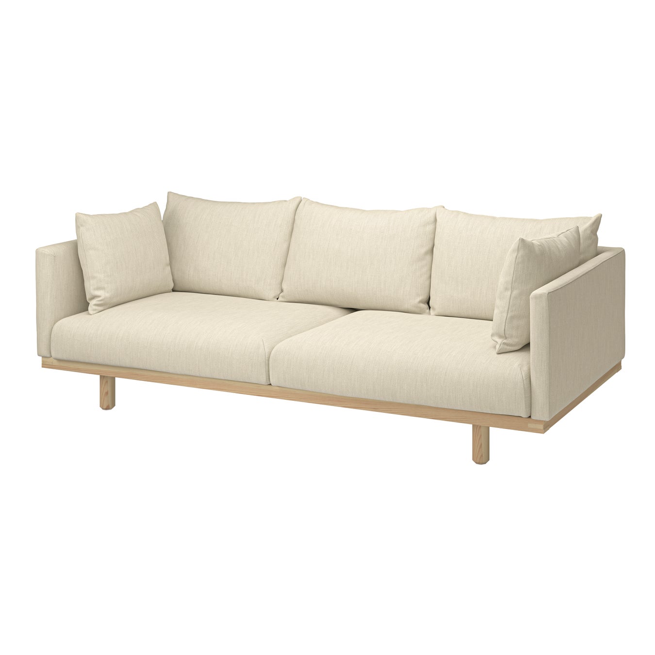 木製のスタイリッシュなディテールと、やさしくゆったりとしたフォルムが、ナチュラルで心地いい雰囲気を演出します。ゆったりとした座面とカーブした背もたれで、包み込まれるような快適な座り心地が楽しめます。綿とポリエステルを混紡したモコモコした生地で、独特の風合いがあり、柔らかな手ざわりで、オーク無垢材製の脚の独特なデザインディテールがぬくもりを添えます。固定具の見えないスマートな構造が、ディテールのかすかなミニマリストスタイルを引き立てます。