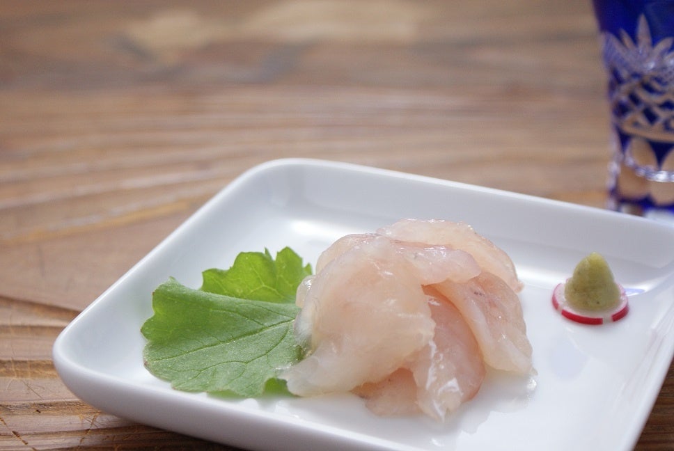 日本最古の雲丹商といわれ、若狭の海の素材を知り尽くす老舗が、旬のぐじを昆布〆に。上品で甘みのある切り身を、三年寝かせた昆布の旨味で包み、繊細な味わいを引き立てました。